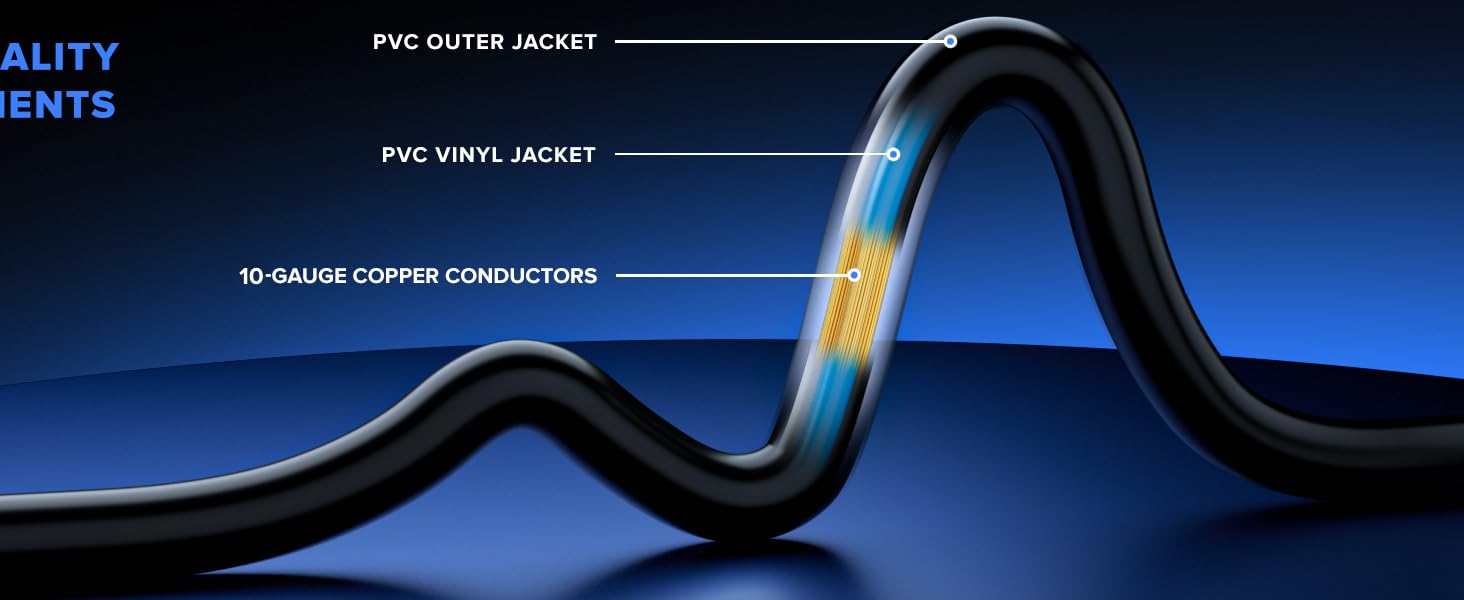 Rugged Durability: SJTW Cord designed to withstand tough conditions, this extension cord features heavy-duty construction with a 10 AWG wire and three conductors. Engineered to resist tearing, abrasion, moisture, and sunlight exposure, it provides unmatched durability and peace of mind for indoor use.